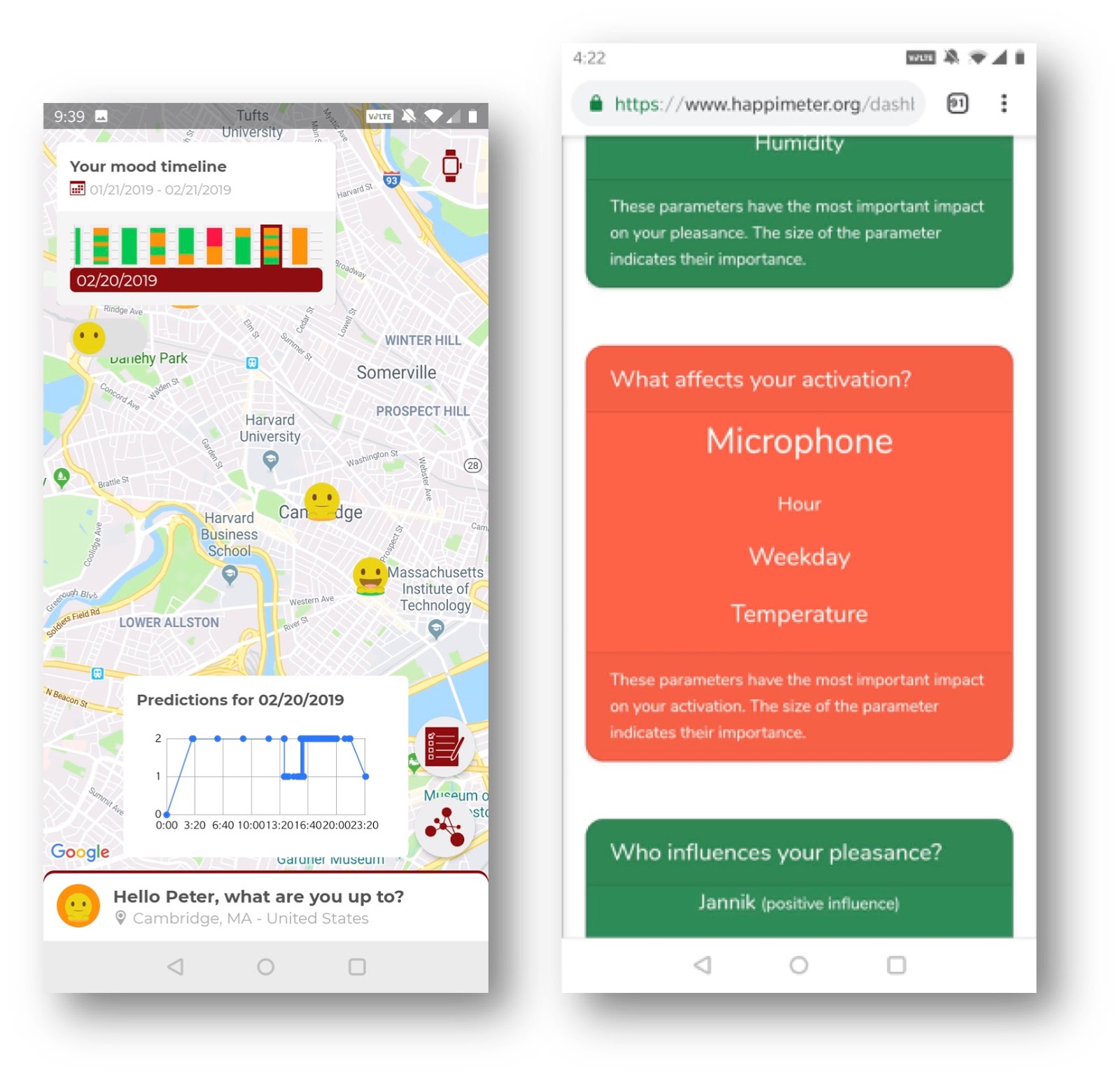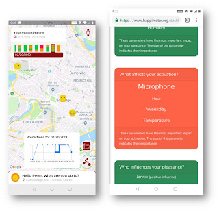 The Social Compass also allows an individual to track the location of their emotional experiences such as how happy the individual has been at a particular day, and where on the map that happiness was measured on that day. The picture below shows a screenshot of my Happimeter Android phone app on February 20, 2019. In addition, the social compass also shows which variables have influenced my happiness, and who has positively or negatively influenced it. Finally, the same virtual mirroring information can also be shown on the Happimeter smartwatch, this function is also used to improve the machine learning accuracy of the emotion prediction of the wearer of the smartwatch.