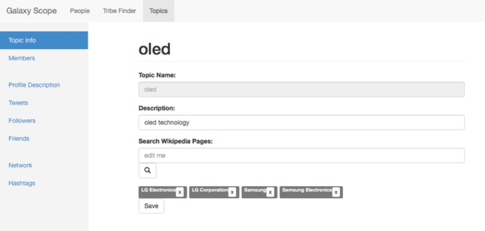 First I define a new tribe called “OLED” in tribefinder and add the Wikipedia pages about “OLED” “LG”, “Samsung” and “Samsung Electronics” as input for the search for tribe members.