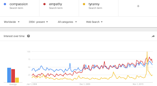 As the zoomed-in picture below shows, “tyranny” is now almost down to its pre-election level. Empathy is back to being the leading trend, running in lockstep with compassion.