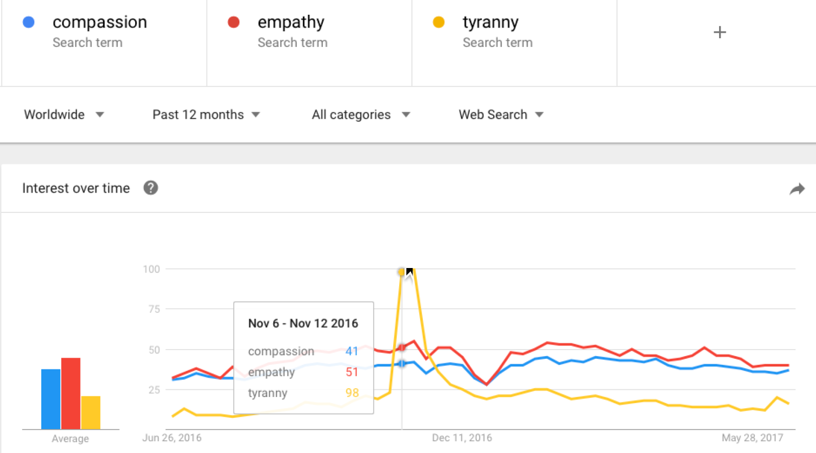 Interesting side note: As the picture below of the last 13 years of Google trends shows, tyranny had a short comeback November 8, 2017.