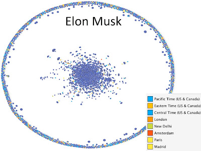 We get a big connected component in the center of the network, this is the active tweeters retweeting and mentioning each other. In the periphery, we have the “asteroid” belt”, made up of the “nobodies”, tweeting their lungs out about “Elon Musk”, while nobody is listening. The coloring tells us that the largest groups of tweeters are from the US Pacific, Eastern and Central Time zones.