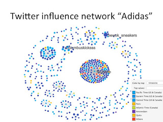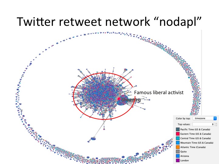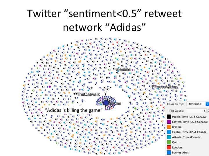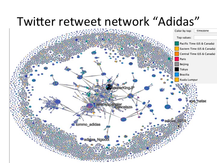 The picture below shows the twitter network, each node is a person tweeting, a link between two people means either that one person is retweeting a tweet sent by the other person, or is mentioning the other person in a tweet.