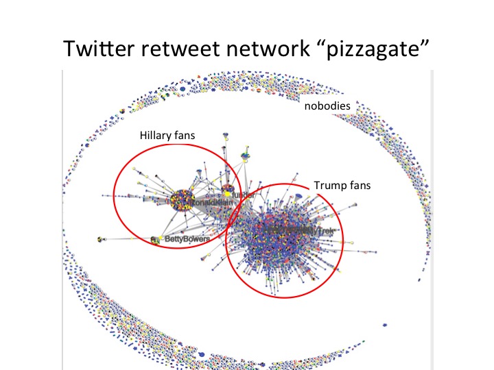 There is a large cluster in the center of the network, made up of believers in the fake news.  They are reinforcing each other, and increasing the traffic in their echo chamber.  The few supporters of Hillary, trying to debunk the fake news, are pushed aside, their tweets are ignored by the large echo chamber of conspiracy theory believers. The people in the periphery (the “asteroid belt”) are tweeting into the void, as their tweets are ignored from friends and foes alike.