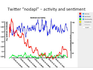 I then proceeded to collect 18,000 tweets about “pizzagate” on December 10, 2016 at about 2pm. As there was feverish tweeting, the last 18,000 tweets only covered about 8 hours. There were between 40 and 120 tweets per minute about pizzagate in this time. The sentiment of the tweets, not surprisingly considering the grisly topic, was rather negative, hovering around 0.4 (sentiment of 0.5 would be neutral, from 0.5 to 1 would be positive.)
