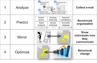It consists of the four steps “Analyze – Predict – Mirror – Optimize”. To illustrate our approach, I describe the analysis of a fortune 500 high-tech company, where we compared e-mail communication of the organization with sales success of their sales teams in the different geographical regions.