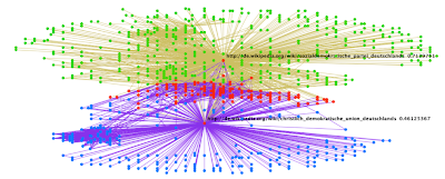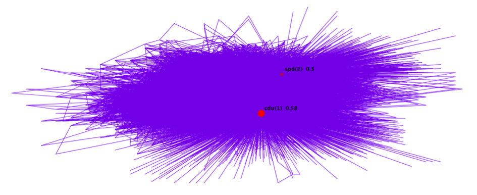 The figure above shows the fetched Twitter network and the betweenness centrality for both search terms. When using the betweenness centrality for calculation, the ration of potential votes between SPD : CDU is 34% : 66%.