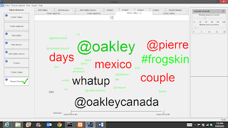 The tweets (sample of 1500) reflect a stronger presence of products or business concepts (iTunes, music, download), mainly from the music area. It is interesting to see words like amazing and kicking in as positive sentiment. The tweets are cleaner, not as many e-retailers looking to generate traffic to points of sales. This might suggest better digital marketing management at Apple as opposed to Oakley.