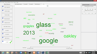I encountered expected words such as "search", "report", "analytics", "page" along with other negative sentiment words (there were very few negative words in Oakley's and Apple's analysis above). Perhaps, the most interesting finding is that the word "GLASS" is associated with negative sentiment. Further analysis shows an association of the word "GLASS" with others such as "Privacy" or "Spy".