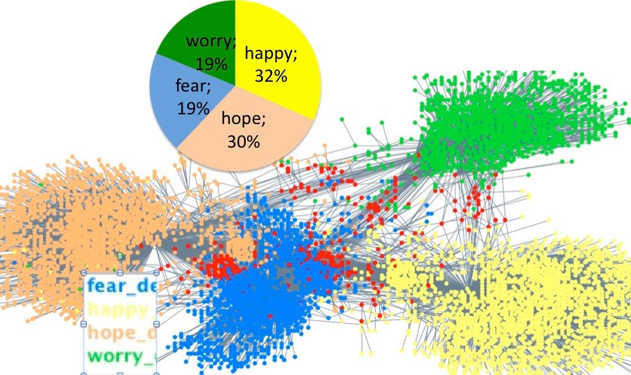 As this picture shows, the tweeters about hope and happiness (yellow and light brown) are mixed in the center, while the tweeters about fear (blue) and worry (green) keep mostly to themselves in the periphery. So even in the Tweetersphere, happy people connect, while worriers stay put at the borders of the tweeter-network.