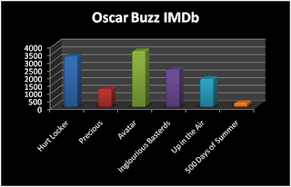 While IMDb users have two clear favorites, Hurt Locker and Avatar, the Web seems to favor Hurt Locker. Bloggers are seeing 500 Days of Summer in front right now, but this might change since the blogosphere tends to be relatively volatile in opinion trends. So, in sum we would expect Avatar to have the best chances on winning best picture, followed by Hurt Locker.